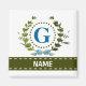 Une couronne de lierre délicate avec un ruban rayé bleu est superposée sur un fond blanc frais. La conception appropriée pour un mariage comporte le monogramme "G" en bleu. L'aimant peut être personnalisé avec n'importe quel nom sur la bannière de ruban vert. Conseil de conception : pour la police présentée ici, utilisez des majuscules pour le nom.
