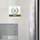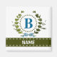 Une couronne de lierre délicate avec un ruban rayé bleu est superposée sur un fond blanc frais. La conception appropriée pour un mariage présente le monogramme "B" en bleu. L'aimant peut être personnalisé avec n'importe quel nom sur la bannière de ruban vert. Astuce de conception : pour la police présentée ici, utilisez des majuscules pour le nom.