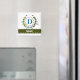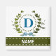 Une couronne de lierre délicate avec un ruban rayé bleu est superposée sur un fond blanc frais. La conception appropriée pour un mariage présente le monogramme "D" en bleu. L'aimant peut être personnalisé avec n'importe quel nom sur la bannière de ruban vert. Conseil de conception : Pour la police présentée ici, utilisez des majuscules pour le nom.