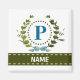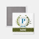 Une couronne de lierre délicate avec un ruban bleu rayé est superposée sur un fond blanc frais. La conception appropriée pour un mariage comporte le monogramme "P" en bleu. L'aimant peut être personnalisé avec n'importe quel nom sur la bannière de ruban vert. Astuce de conception : pour la police présentée ici, utilisez des majuscules pour le nom.