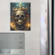 Cette oeuvre d'art présente un crâne orné, orné d'une couronne royale, intimement mêlé de vignes luxuriantes et de fleurs éclatantes. Des bougies à flickering ajoutent une lueur mystique, jetant des ombres dynamiques qui donnent vie à la scène. Tout cela dans un cadre forestier serein, créant un équilibre saisissant entre beauté et mystère.