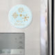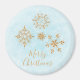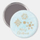 Un aimant avec une illustration de flocons de neige dorés de fantaisie aux formes cristallines élégantes. Un arrière - plan bleu clair glacé. Le texte dit Joyeux Noël.