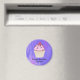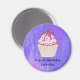 Un aimant d'anniversaire personnalisé avec un nom et conçu avec une illustration d'un cupcake à l'allure délicieuse. Le gel rose et les gouttelettes de chocolat. Porte-cupcake jaune et framboise sur le dessus. Yummy ! L'arrière - plan est une texture abstraite violette avec de petits coeurs parsemés autour.