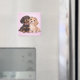 This charming illustration features an adorable dachshund couple sitting close together against a soft blush pink background. With their long bodies, floppy ears, and sweet expressions, this artwork captures a playful and romantic puppy-love vibe that dachshund fans adore.