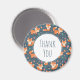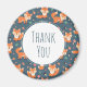 Un aimant de remerciement avec un motif fait de renards orange mignons et heureux. Arrière - plan vert foncé. Petits champignons et feuilles parsemés. Un cercle blanc superposé avec merci écrit à l'intérieur.