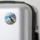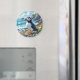 A puffin themed magnet. A beautiful vibrant colorful ai illustration of a puffin watching the ocean waves by the sea shore surrounded by rocks, dunes and flowers.