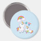 Un aimant avec une licorne mama blanche avec une crinière et une queue colorées fantaisie. Un bébé licorne posé à côté d'elle, avec une sucette verte dans la bouche. Un arc-en-ciel coloré aux nuages moelleux, et quelques étoiles et coeur décorent ce design doux et adorable. Un contour rose et audacieux entourant l'image lui donne une ambiance de doodle à l'enfant. Arrière - plan pastel bleu clair.