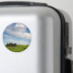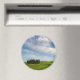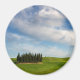 Aimant souvenir rond avec un groupe de cyprès dans un paysage de collines vertes et de fleurs jaunes sous de beaux nuages blancs près de Torrenieri dans le Val d'Orcia (vallée de l'Orcia) en Toscane, Italie.