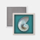 Coquille intérieure d'un nautilus sur un arrière - plan turquoise sertie dans un effet de boîte d'ombre avec un tapis beige.
