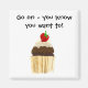 Un aimant carré, frigo blanc avec un cupcake au chocolat d'allure lustre, surmonté de crème et d'une fraise, d'un collage en papier peint à la main par Judy Adamson. Les mots au-dessus du cupcake sont : "Allez - vous le voulez !" en noir. L'aimant de réfrigérateur parfait pour tester la résolution de n'importe quel diètre! Ce cupcake est également disponible sur une carte de voeux et un T-shirt à sangle pour dames.