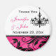 Ce cadeau de mariage moderne et tendance en forme de magnet de remerciement avec lustre en rose fuchsia, noir et blanc a une bordure ornée de volutes et de rouleaux roses et noirs qui correspond à l'invitation de mariage présentée ci-dessous. Vous pouvez également le personnaliser pour qu'il dise "Save the Date" et l'utiliser pour annoncer vos prochains noces à votre famille et à vos amis. Si vous avez besoin d'autres articles assortis, veuillez envoyer votre demande par courriel à niteowlstudio@gmail.com.