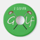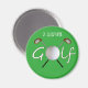 Magnet personnalisable "I Love Golf". Aimant vert avec des clubs de golf croisés à sillage avec une balle de golf blanche dans le centre. La couleur de l'aimant peut également être customisée.