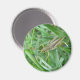 Cet aimant brillant présente une photo macro détaillée d'une petite sauterelle verte avec des marques marron tressées sur l'herbe. Sur la photo vous pouvez voir le détail des jambes articulées, des antennes longues et des yeux noirs et or de la sauterelle.