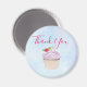 Aimant de Merci avec l'illustration d'un délicieux cupcake aux tourbillons roses et d'une baie aux feuilles nichés dans le gel. Placé sur un arrière - plan pastel bleu clair.