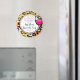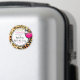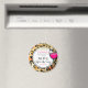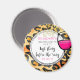 Un aimant pour une soirée bachelorette. Un léopard tache motif pour un arrière - plan. Un verre à vin à l'allure cool, surmonté d'une épaisse encre noire. Le vin à l'intérieur du verre est rose chaud. Couleurs vives et vives. Personnalisez avec vos infos de bachelorette sur un cercle blanc dessiné à la main. Dernier fling avant l'anneau écrit dans une police cool tendance. Une image de parties scintillant en faux or donne les illusions de parties scintillant aspergées le long du sommet.