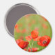 Aimant photo rond avec des fleurs de pavot rouge vibrantes dans un champ vert plein de pavots. Il a une forte émotion de bonheur, printemps et été.