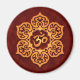 Un design Aum ou Om se trouve à l'intérieur d'une fleur de lotus stylisée. Le motif circulaire est coloré d'un jaune doré qui est mis en surbrillance pour créer une brillance légère à la surface. L'arrière - plan est peint en rouge profond qui peut être vu à travers l'espace négatif de la fleur. Une ombre apparaît juste sous le design, ce qui donne l'impression de flotter juste au-dessus de la surface de l'aimant. Ce design élégant est une représentation frappante de ce symbole spirituel.