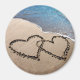 Belle photo originale de deux coeurs écrits dans le sable le long de l'eau bleue de l'océan pour signifier amour et romantisme. Super concept pour les mariages d'été à venir.