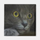 Un gros plan du visage d'un chat gris aux yeux jaunes et des pupilles dilatées, reposant sa tête sur sa patte et regardant attentivement quelque chose derrière la caméra.