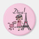 T-shirts de diva, combinaisons, tasses, sacs, cartes, autocollants, porte - clés, coussins, horloges murales, et beaucoup plus avec une conception mignonne de diva comportant une fille d'une chevelure noire dans un casquette et une robe rose avec son caniche rose près de Tour Eiffel !