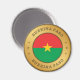 Le drapeau burkinabé est encastré dans un faux anneau d'or arrondi. Les mots "Burkina Faso" se trouvent en haut et en bas de la conception et ont un effet pressé. La paire de trois étoiles décoratives les unes en face des autres, est également conçue avec un effet pressé.