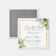 Cet élégant aimant botanique Save the Date est encadré de beaux feuilles d'aquarelle verte et de jolies vignes d'olivier. Cet agréable accent vert et couleur foncé est parfait pour un événement chic d'automne pour une mariée et un marié moderne. encadré d'un joli carré doré derrière l'accent de la feuille verte.