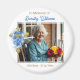 Un souvenir magnétique photo mémorial pour les funérailles, la célébration de rassemblements de vie ou à envoyer aux amis et à la famille en l'honneur de quelqu'un qu'ils ont perdu. Vous pouvez ajouter une photo dans la zone personnalisée. Les couleurs d'accent utilisées sont le bleu et l'or. Il y a une croix dorée avec des fleurs bleues dessus.