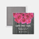 Un aimant à dater avec un bouquet de roses roses chauds sur un arrière - plan de bois d'écorce. Personnalisez le texte. Recherchez les invitations correspondantes à The Pink Schoolhouse.