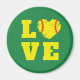 Aimant rétro d'inspiration vintage "Amour" avec une icône de coeur de softball au milieu du mot "AMOUR" en jaune et vert, parfait comme un cadeau d'équipe, entraîneur merci, ou baseball ou softball thème fête d'anniversaire. Idéal pour les nuits de prix et les peluches de bas pour l'entraîneur de baseball ou le joueur de softball.