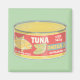 Un style publicitaire rétro illustrant une boîte de thon. Cette boîte de poisson a un étiquette qui dit que le thon est élevé dans Oméga 3 et pêché de manière durable. Attention à tous ceux qui aiment la nourriture en conserve / en conserve
