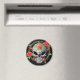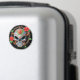Ce dessin complexe de crâne à sucre est placé sur le sommet d'une étoile cinq points encadrée par un grand cercle. Le crâne est décoré de tourbillons et de points ainsi qu'un grand rose et feuille au milieu du front. Des vignes délicates se tissent autour du cercle extérieur avec deux roses apparaissant de part et d'autre. Le crâne est assis sur un pur arrière - plan noir donnant à cet aimant un beau contraste. Ce magnifique crâne à sucre Day of the Dead fait un motif agressif et élégant.