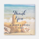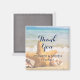 Un aimant de remerciement pour un mariage (ou un autre événement). Conçu avec une photo mignonne d'une étoile de mer positionnée debout dans le sable. Sous ses bras se trouvent 2 petits coquillages reposant confortablement. Installé sur une plage avec des vagues qui se brisent en arrière-plan.