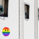 face contre les rayures du drapeau arc-en-ciel.
