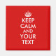 Faites votre propre rester calme en disant avec ce modèle personnalisable. Il a le logo de la couronne calme. Il dit Conserver le calme et votre texte. Ajoutez vos propres mots dans le modèle pour personnaliser. Vous pouvez modifier le style ou la couleur de la police pour customiser. Ou ajoutez une autre couleur arrière - plan. Montrez votre propre personnalité ou intérêt. Vous pouvez faire un design pour n'importe quelle occasion. Cela fait un cadeau merveilleux pour cette personne pour laquelle vous ne savez pas quoi acheter. Plus gardez calme posters, chemises et objets personnalisables sur Keep Calm and Your.