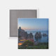 Aimant photo souvenir avec les grands rochers Faraglioni dans l'eau de la Méditerranée et l'ancienne Tonnara rouge, usine de thon à Scopello, sur la côte nord de la Sicile, Italie à l'Heure Bleue du crépuscule.