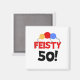 Trois ballons de couleurs primaires et noir et texte qui dit "Feisty 50" sur des cartes humoristiques de 50ème anniversaire, T-shirts, tasses, et plus encore.