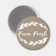 Aimant mignon avec un cadre de lauriers blancs et un badge environnant avec l'expression "ferme fraîche" sur un arrière - plan de burlap FAUX. Cet aimant est une grande touche pour votre réfrigérateur dans une cuisine de ferme!