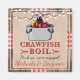 Cette conception de style rustique présente un fond en bois avec un ruban de style nappe à carreaux rouge et blanc. Par-dessus cela, il y a une texture de toile de jute avec un crabe de dessin animé mignon. La police de caractères serif et manuscrite rouge et noire est entièrement personnalisable pour votre événement, qu'il s'agisse d'une ébullition de crabes, de homard, de fruits de mer ou de poisson. Célébrez vos fiançailles, anniversaire, remise de diplôme ou tout événement avec style ! Ceux-ci font de superbes cadeaux de fête souvenirs !
