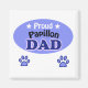Trotse Papillon (hond) vader. met een groot blauwe circel en 2 witte sterren en 2 honden poten. Toon a vidé van dit hondenras.