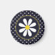 Un aimant rond avec une fleur de marguerite girly rétro sur le dessus avec des marguerites blanches avec un centre jaune contre un arrière - plan bleu marine, et un motif à pois bleu et blanc tendance à l'extérieur.