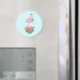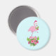 Un aimant avec un flamant de Noël à thème tropical portant un chapeau de santa rose. Sous ses pieds se trouve un bouquet de sucre de canne avec de jolies fleurs tropicales et des baies roses. Un bourgeon de saint sur sa poitrine.