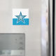Design moderne avec une étoile bleue et blanche "brillante" sur un arrière - plan blanc et bleu. Aimant frigo avec un design personnalisable en or et blanc pour vous permettre de personnaliser avec votre propre texte, images et idées. Veuillez noter qu'il s'agit d'une image imprimée créée à l'aide de photographies originales et de techniques numériques, elle ne brille pas ou ne contient pas de vrais étincelles.