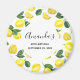 Un aimant d'anniversaire avec un mignon motif de citrons jaunes avec des feuilles verts et des tranches de citron fraîchement coupées. Un cercle blanc superposé avec votre texte à l'intérieur.