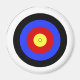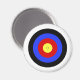 Un simple aimant frigo rond amusant pour archers et entraîneurs de tir à l'arc, chasseurs d'arc et autres tireurs et hobbyistes compétitifs, avec une cible de tir classique avec un oeil-taureaux jaune entouré de anneaux rouges, bleus, noirs et blancs.