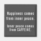 Un aimant gris et blanc amusant et moderne pour la cuisine définit ce qui et d'où vient le bonheur et la paix intérieure. Texte : Le bonheur vient de la paix intérieure. La paix intérieure vient de la caféine.