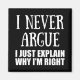 Si vous aimez les citations sarcastiques drôles ou de grands dessins humoristiques, alors ce slogan original "Je ne prétends jamais que j'explique juste pourquoi j'ai raison" est pour vous. C'est un grand cadeau pour votre famille, vos amis ou vous-même ! Ce design est idéal pour tous ceux qui aiment le sarcasme et l'humour. Si vous aimez cette citation drôle, découvrez d'autres oeuvres similaires dans le magasin Omitay. Restez en sécurité et merci de soutenir un artiste local.