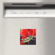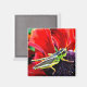 Cet aimant aux couleurs brillantes est doté d'une sauterelle verte, jaune et noire brillante perchée au centre violet d'une fleur aux pétales rouges magnifiques.