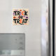 Ce design d’Halloween capture l’esprit festif et fantaisiste de la saison avec une palette de couleurs vives et un thème ludique. Les mots “TRICK OR TREAT” sont affichés en grand au centre, avec des lettres noires audacieuses surmontées de touches orange, donnant l’impression d’une typographie dansante. Autour du texte, une collection éclectique d’icônes emblématiques d’Halloween, notamment des citrouilles souriantes orange vif avec des découpes noires pour les yeux et la bouche, des chauves-souris noires aux ailes déployées, des bonbons violets et oranges en forme de bonbon ou pièce, une toile d’araignée blanche dans le coin supérieur droit avec une petite araignée suspendue, et plusieurs petits fantômes violets flottants. L’ensemble évoque une ambiance joyeuse et enfantine propre à la célébration du 31 octobre.