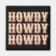 Style rétro cowboy "Howdy Howdy Howdy" design de texte avec des lettres rayées dans les couleurs jaune, rouge et beige