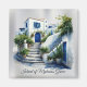 Image aquarelle d'une scène de l'île de Mykonos, Grèce. Un arrière - plan satiné blanc complète le cadre.